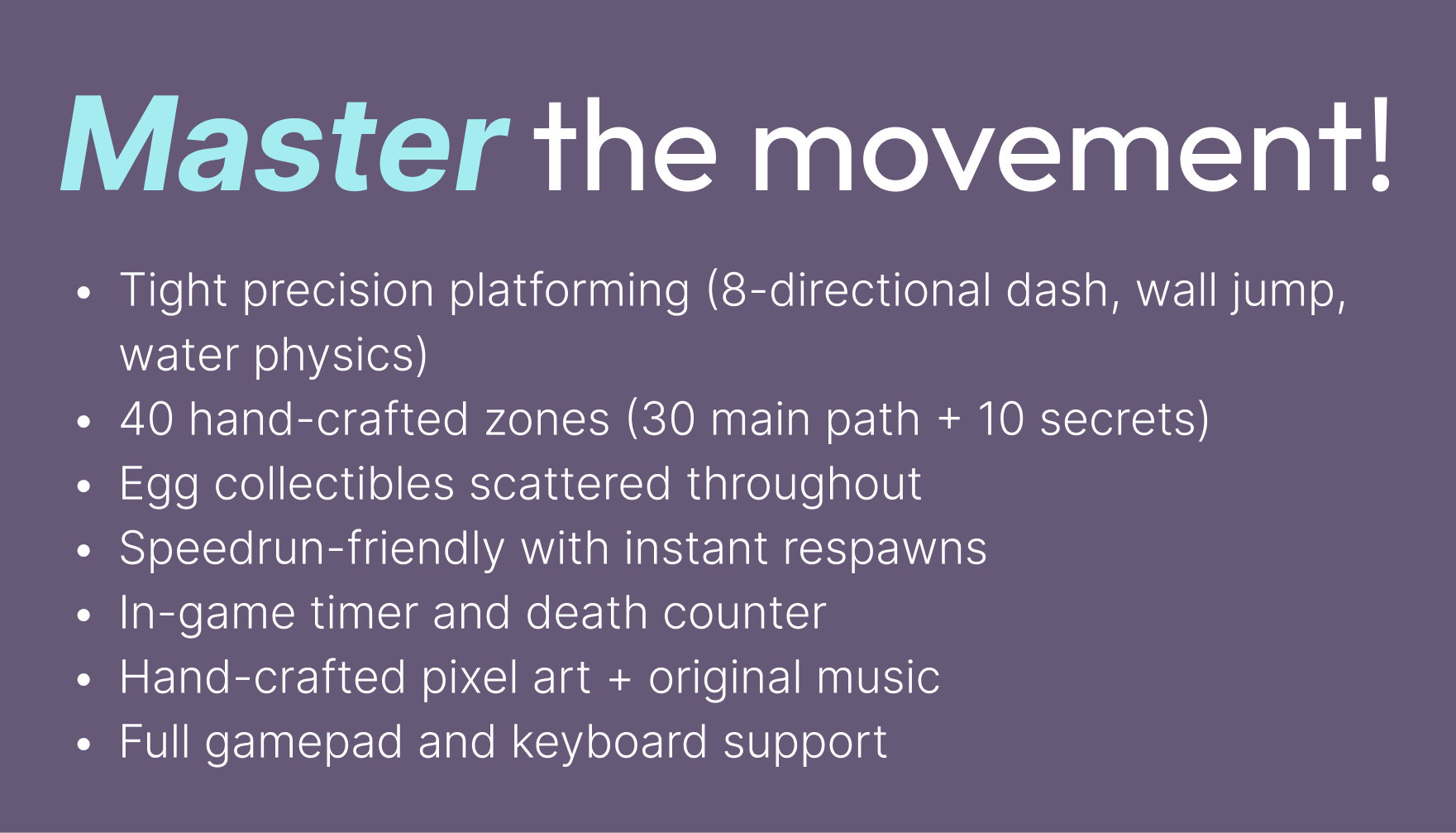 | Tags | 2D, Controller, Difficult, Fast-Paced, Pixel Art, precision-platformer, Singleplayer, Speedrun |