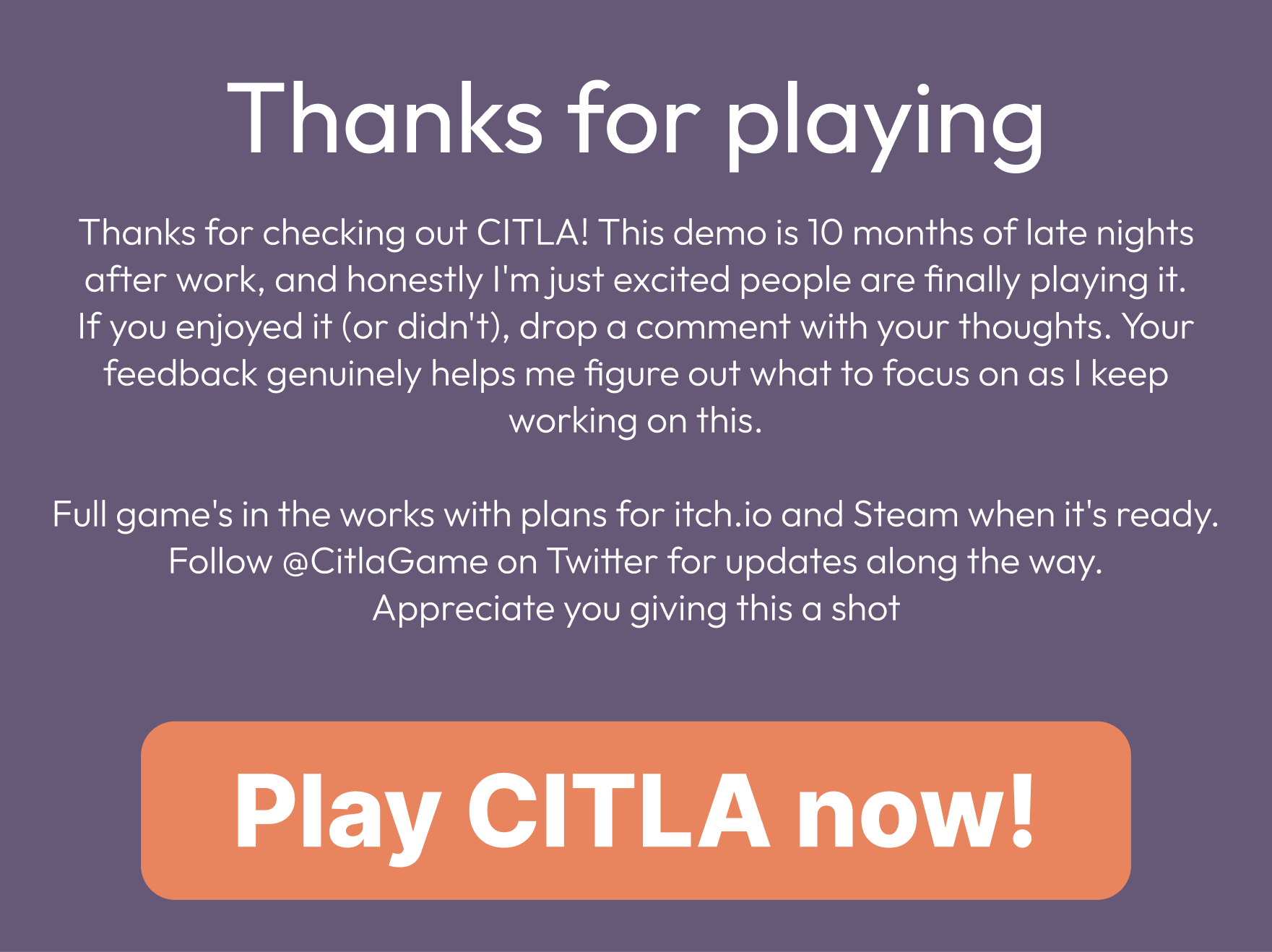 Me encantó la atmósfera, la temática y el diseño de todo! Esperando con ansias la versión completa :D